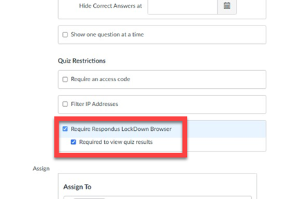Build the quiz in the Canvas course, as normal, and select the option to “Require Respondus LockDown Browser” and “Required to view quiz results.”
