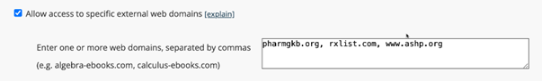 Allow students to access a list of specified web domains during the test. The specific web domains must be entered for student access. (REQUIRED if accessing outside materials/resources)